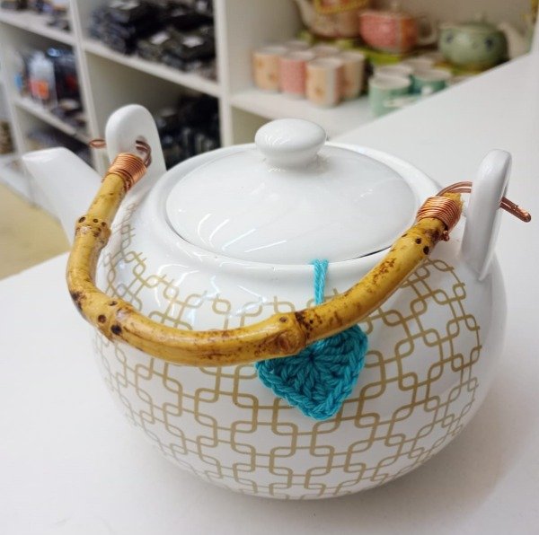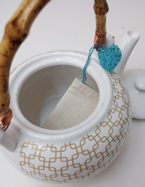 Tetera de porcelana, con manija de madera estilo rustica. Infusor de tela reutilizable con corazon de crochet